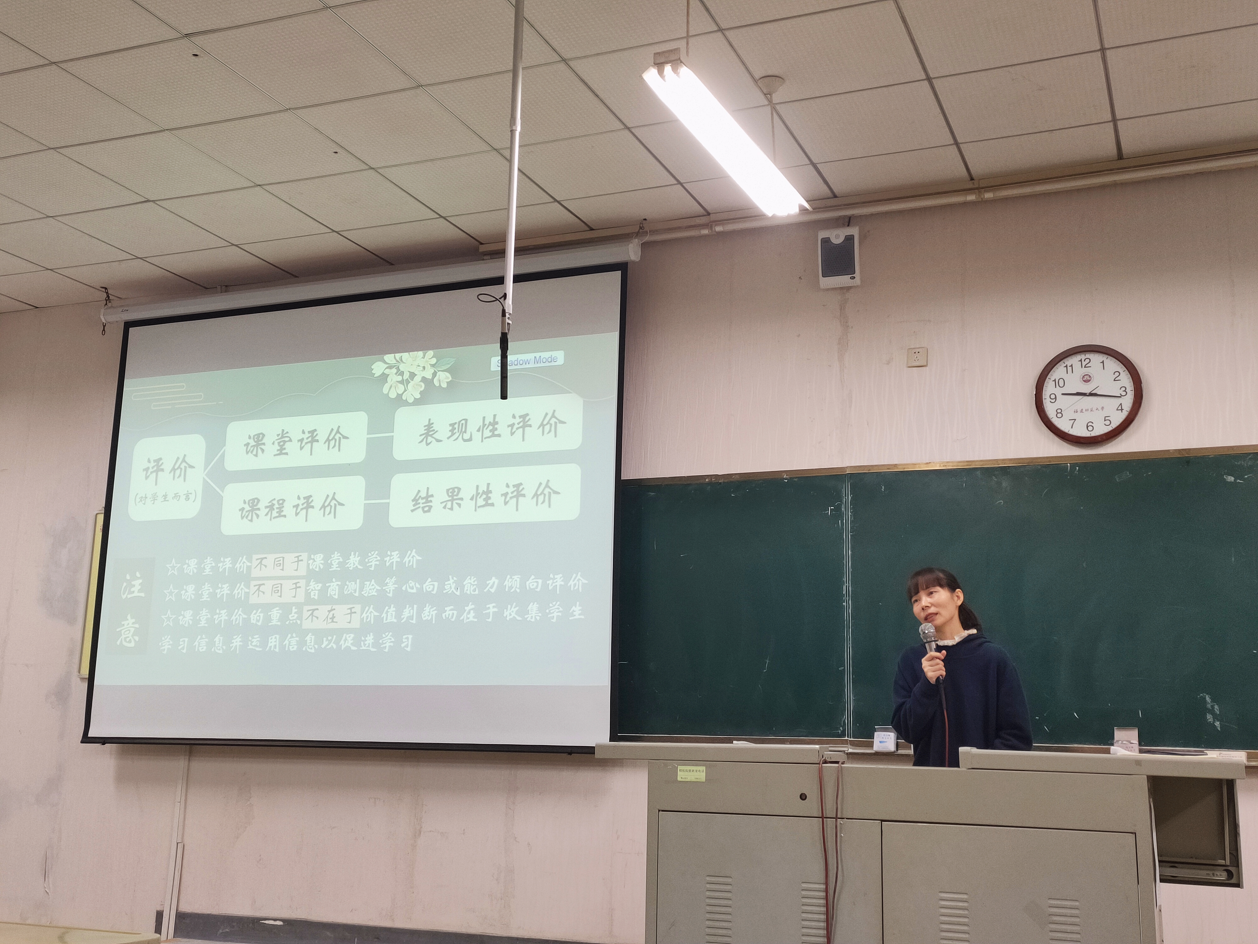 杨秀珍老师从“双减”政策下一线教师面临的挑战导入,从课前小测、课堂设计、课堂对话、学科作业、实践环节五个方面剖析了思政课教学及评价中的问题,提出几个解决措施:一是巧借热点、活用知识进行课前播报,激发学生兴趣、扩充课程资源、培养学生情感、提高学生综合素质;二是课堂设计应明确目标、精设问题,注重教——学——评的一致性;三是课堂对话应提升思维、激扬情绪,着眼内涵以促进思维力的提升,激扬情感以促进内驱力的燃烧;四是学科作业应优化方法、激励学欲,注重发现学习以优化学习方法,撰写评语以激励学习欲望;五是实践环节应培育素养、面向成长,在参与中学习,以成长为导向实现素养培育。同时,杨老师还结合典型故事案例,引出同学们对教育的反思,提出要坚持立德树人根本任务,深入贯彻落实“双减”政策。