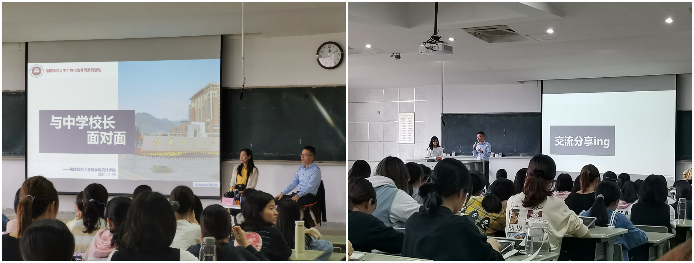 11月5日下午,举办“与中学校长面对面”活动,邀请到了福州华侨中学刘燕校长和福州延安中学陈国平副校长参加本次活动。刘燕校长首先介绍了师范生素养的养成,用人单位对中学数学教师招聘以及新高考下的数学教学模式等;陈国平副校长针对师范生综合能力素质的形成给出合理建议,分享了数学师范生在职场竞争力应具备的能力等。互动环节上,气氛温馨且活跃,两位校长就同学们提出了“信息技术在教学过程中有何要求”、“毕业生如何快速适应教师角色”、“大学专业课程对成为教师是否有用”,“如何看待和应对‘双减’政策”等问题,一一给出的解答并提出了诸多建议。