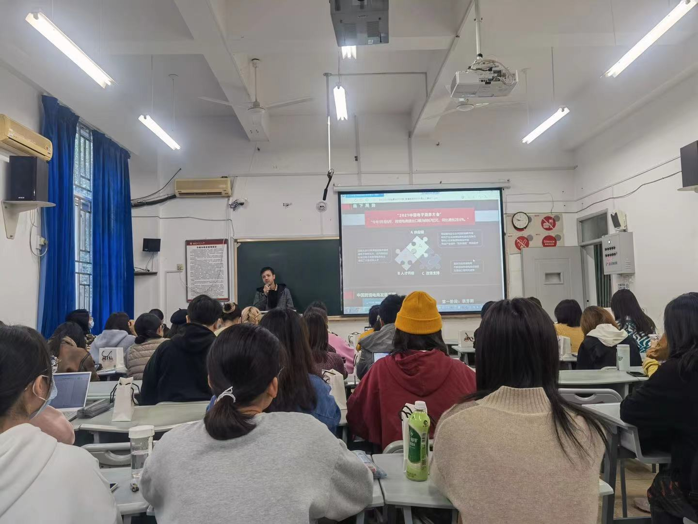 2021年11月9日上午,福州达砾森贸易有限公司黄夏昕总经理为外国语学院学生开展题为《跨境电商中的外语人:机遇、优势与挑战》的讲座,讲座由英语教育系主任闫小斌博士主持。