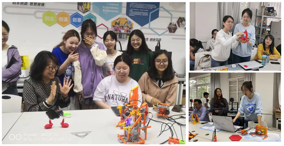 图2 创客实验室中,同学们交流分享STEM创新课程与教具,师生互动、其乐融融