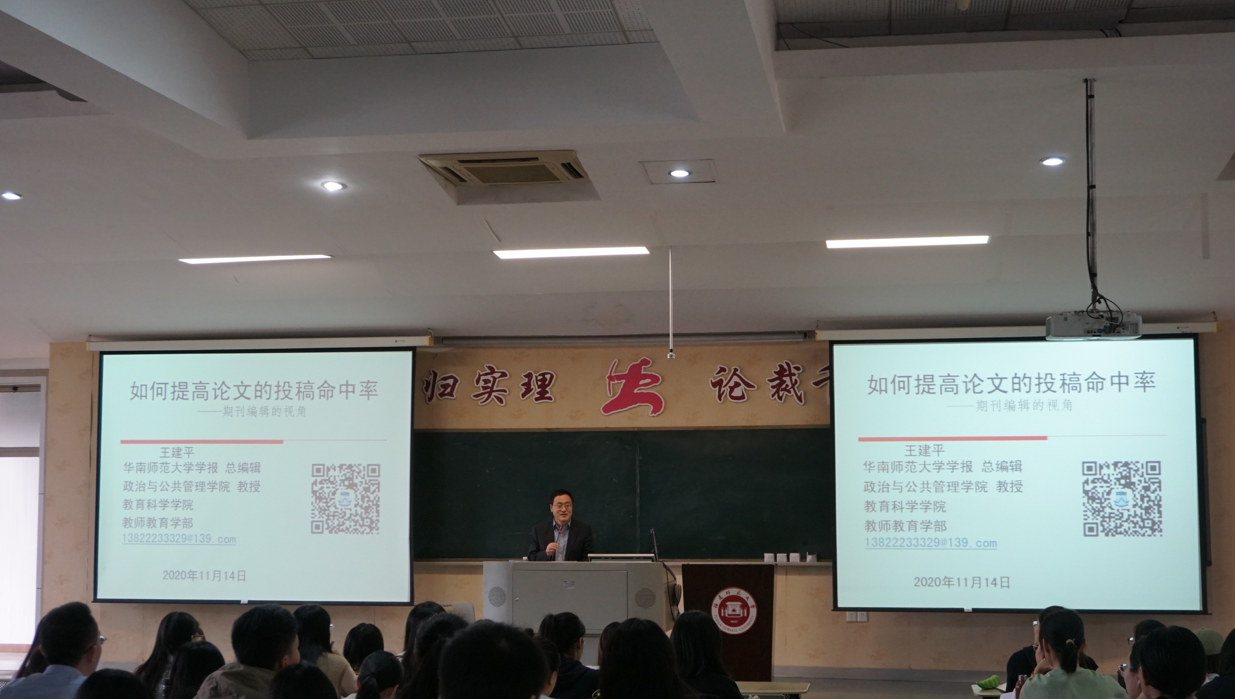 11月14日上午,教育学部个性化培养周教育在旗山校区名师讲堂继续进行。华南师范大学学报编辑部主任、总编辑王建平研究员应邀为师生作《如何提高论文投稿命中率——期刊主编的视角》专题讲座,学部师生200多人到场聆听。讲座由学部部务委员王伟宜教授主持。