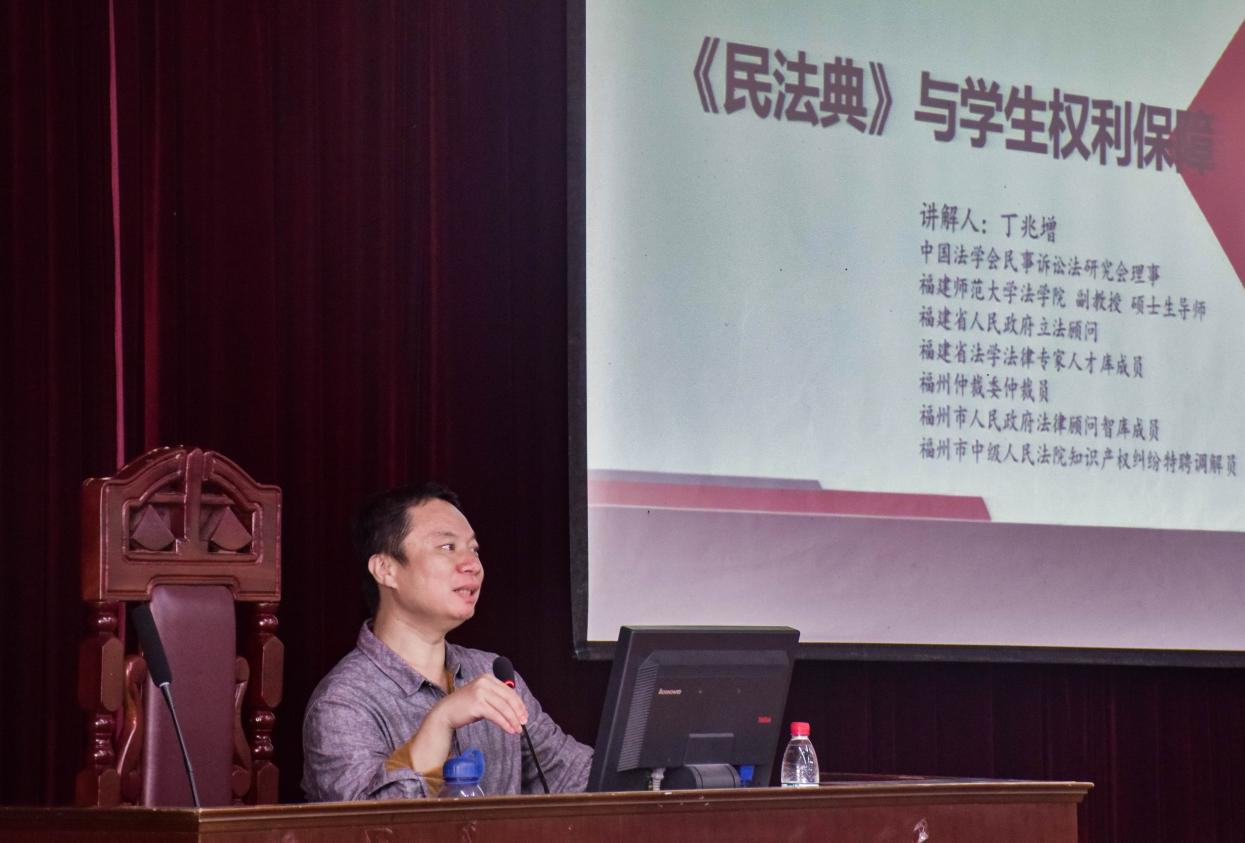 为贯彻落实习近平总书记关于“加强民法典重大意义的宣传教育”指示要求。11月16日上午,法学院面向全校学生开展的个性化培养周特色课程《民法典与学生权利的保障》于致广2-102举行,福建省法学法律专家人才库成员、中国法学会民事诉讼法研究会理事、福建省人民政府立法咨询顾问、福州仲裁委仲裁员、福州市人民政府法律顾问智库成员丁兆增副教授用生动形象的话语为学生们讲授民法典中与学生权利密切相关的内容。